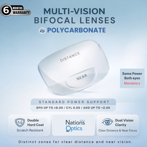 Experience precise dual-focus clarity with multi vision bi-focal prescription lenses designed for users who need both distance and reading correction in a single lens. Crafted from polycarbonate optical material, these lenses provide lightweight comfort with enhanced impact resistance for everyday wear.
