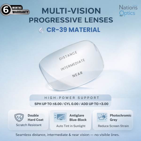 These CR-39 multi vision progressive Blue Block Photo Grey lenses offer adaptive light control, digital protection, durability, and precise high-power correction — perfect for modern prescription eyewear with different powers in each eye.