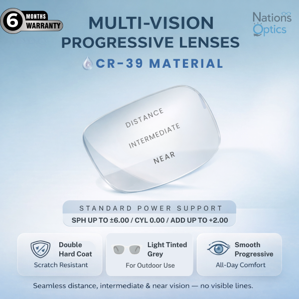 These CR-39 multi vision progressive Light Grey lenses combine smooth visual transition, glare control, and durable scratch-resistant protection — making them a reliable everyday eyewear solution for users with different power in both eyes.