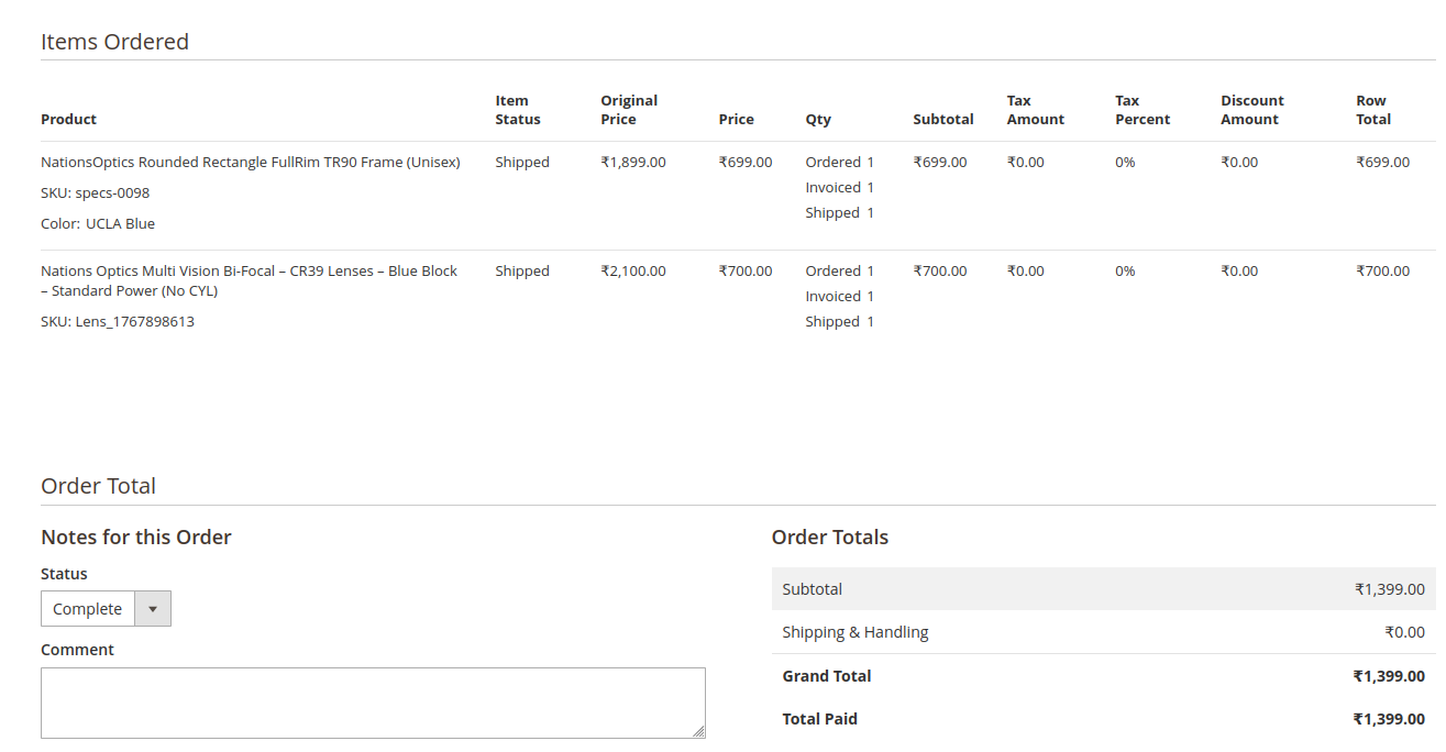 Complete breakdown of frame cost, lenses, shipping, and final payable amount.