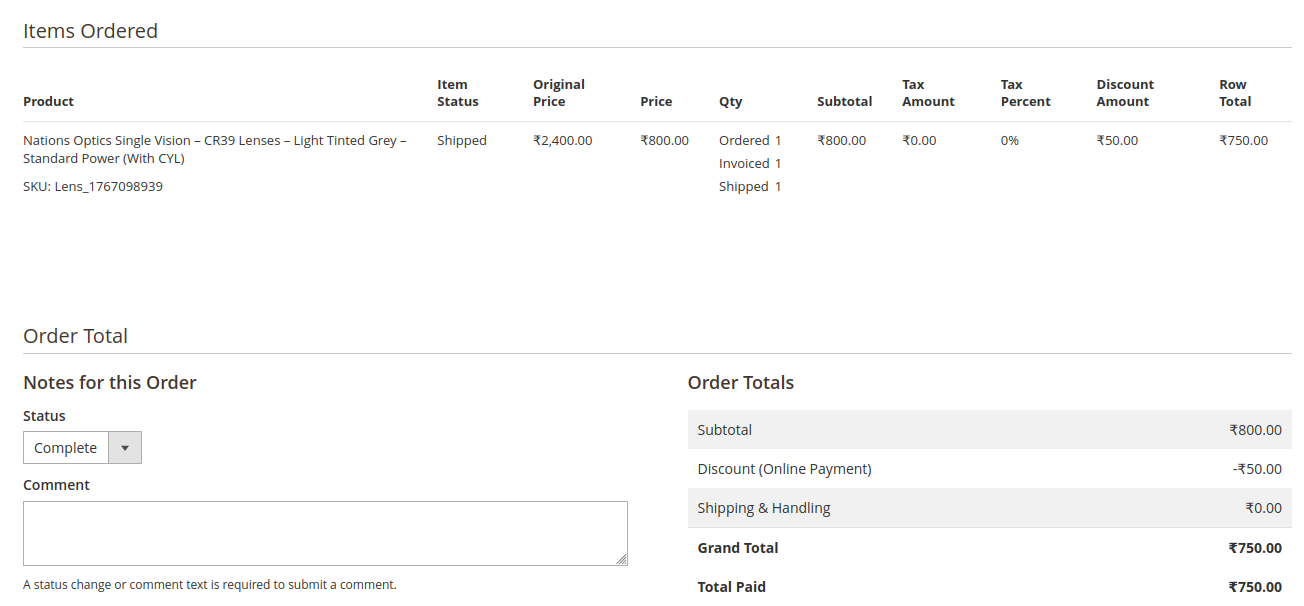 Complete breakdown of frame cost, lenses, shipping, and final payable amount.