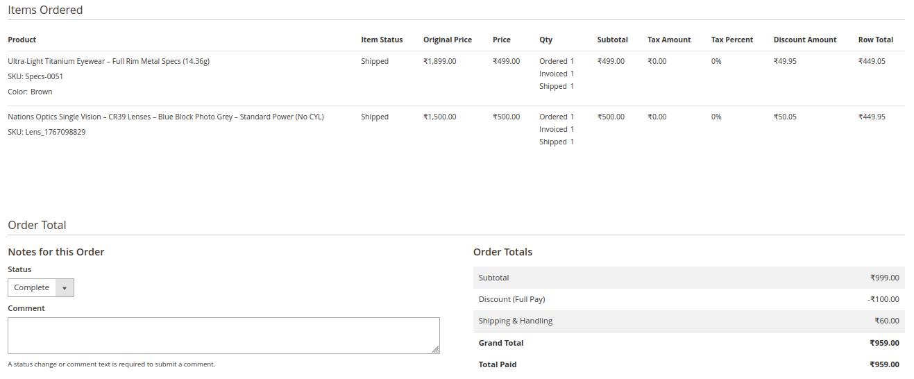 Complete breakdown of frame cost, lenses, shipping, and final payable amount.