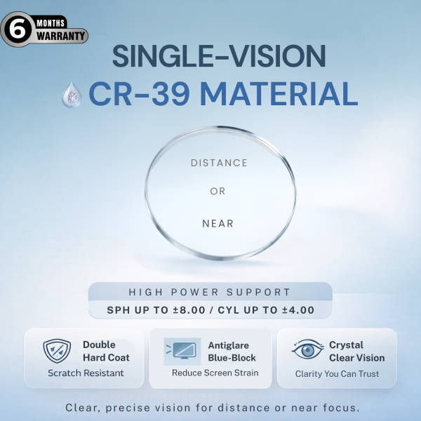 Experience sharp and reliable clarity with single vision prescription lenses designed to provide one uniform power across the entire lens surface. Crafted from CR-39 optical material, these lenses deliver excellent optical clarity with lightweight comfort for everyday wear.