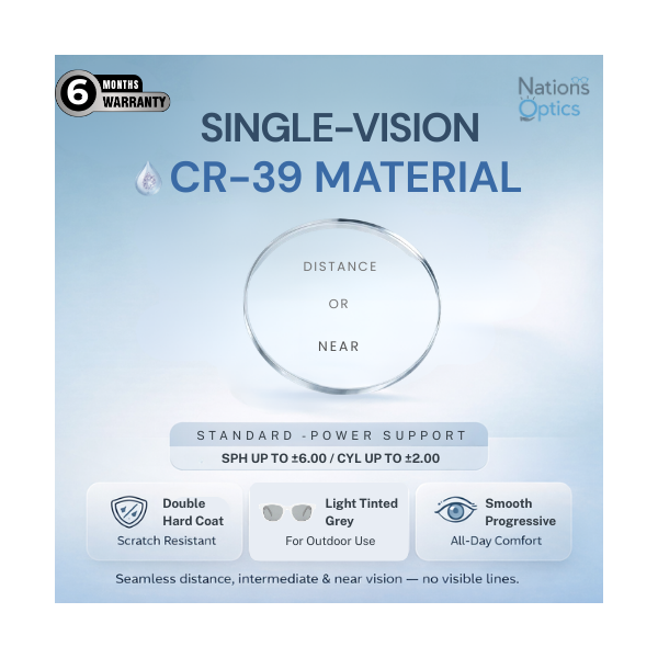 These single vision CR-39 light grey tinted lenses combine visual clarity, glare reduction, and reliable cylindrical correction — making them a practical solution for everyday and night-driving prescription eyewear.