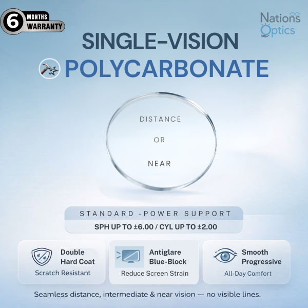 These single vision polycarbonate blue block lenses combine safety, digital protection, and reliable cylindrical correction — making them a practical and durable solution for everyday prescription eyewear.