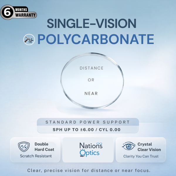 These single vision polycarbonate lenses combine safety, durability, and reliable visual clarity — making them a practical solution for everyday prescription eyewear.
